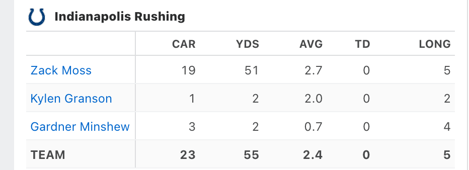Now, the track record that Moss has this season will suggest that the Colts will be just fine moving forward with the run. He still has over 700 yards rushing and a 4.5 average, so while this game was a big disappointment, it’s safe to say that this type of production is an anomaly. It is not good for Indy to get in situations where Minshew is throwing 40+ times in a game.