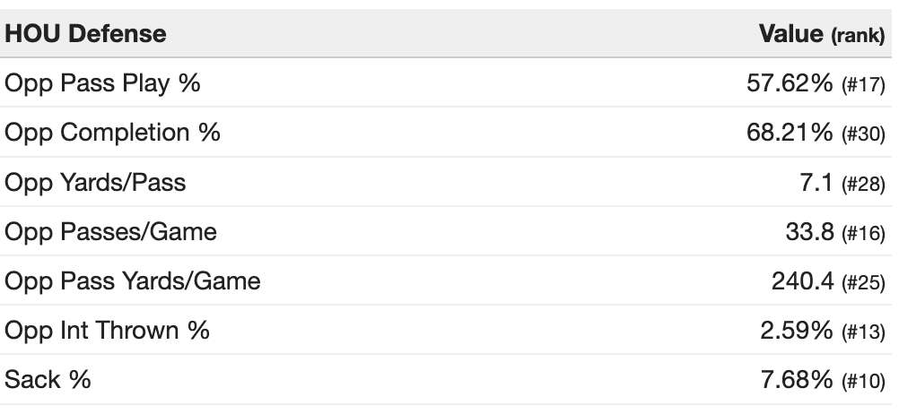 In their week 2 matchup in which Zack Moss started at RB, Moss racked up 88 yards on 18 carries and the Colts as a whole put up 126 yards on the ground. A case could be made that the rushing success was due in large part to Anthony Richardson who, in the first half, was healthy and put up 35 yards on the ground and 2 TDs. Gardner Minshew is nowhere near the runner that Richardson is, but Minshew can be elusive in the pocket and create plays out in space with his legs or with his arm. Houston’s defense against the pass has been middle of the pack or worse in many major categories, but the Colts do not want to rely on Minshew throwing 40+ times as he has proven to be a bit reckless with the football.